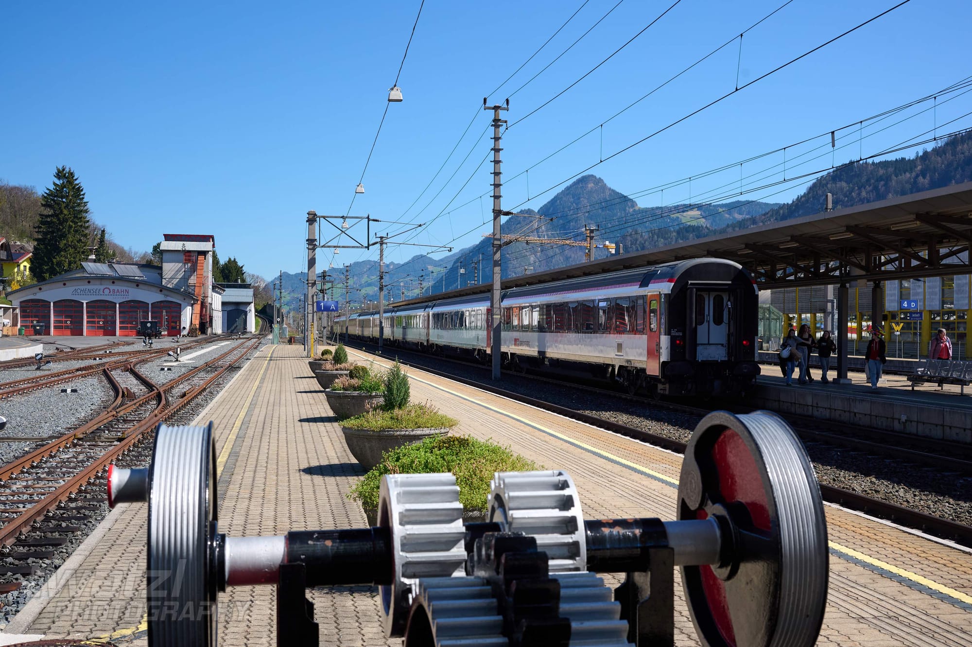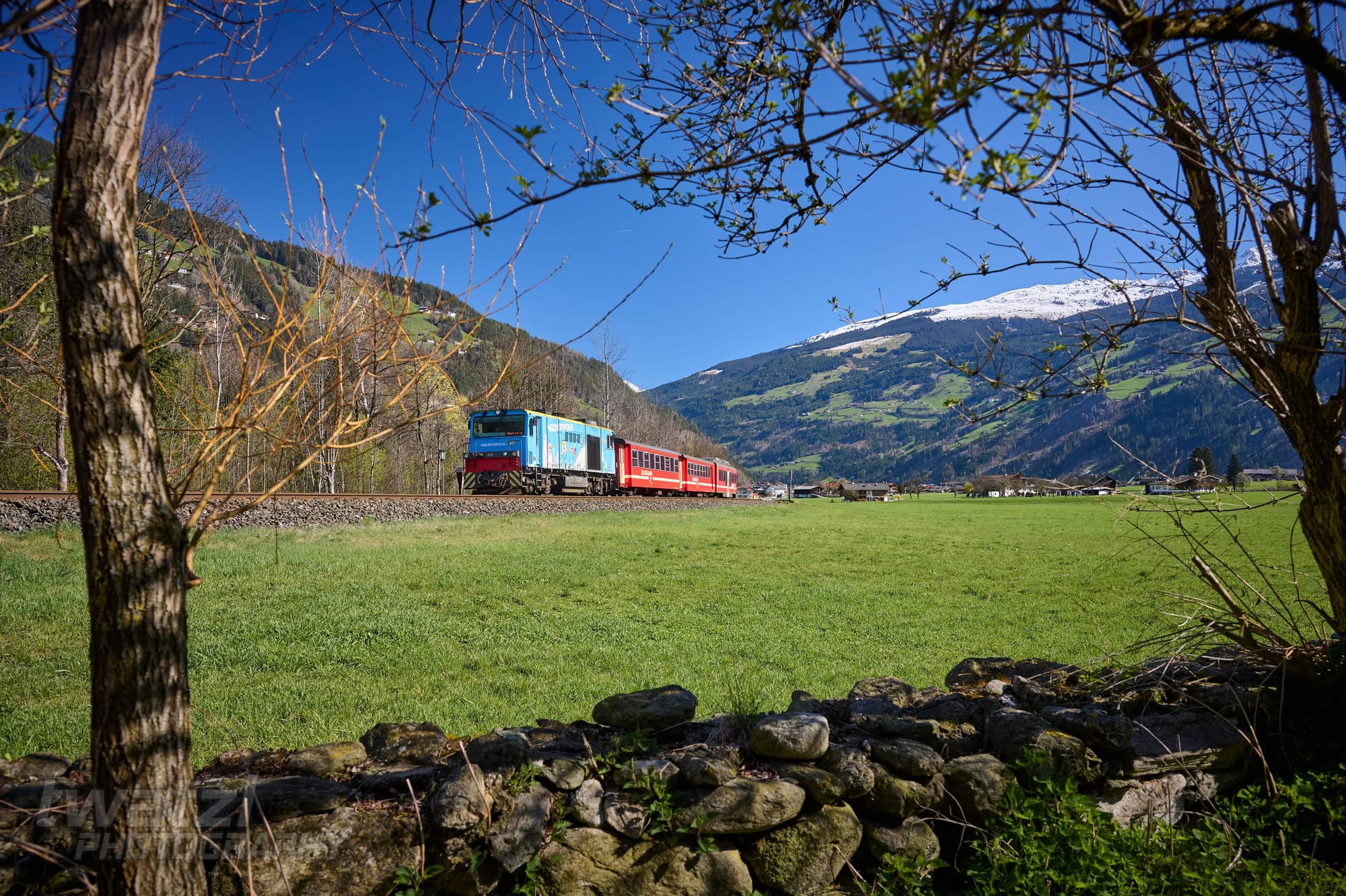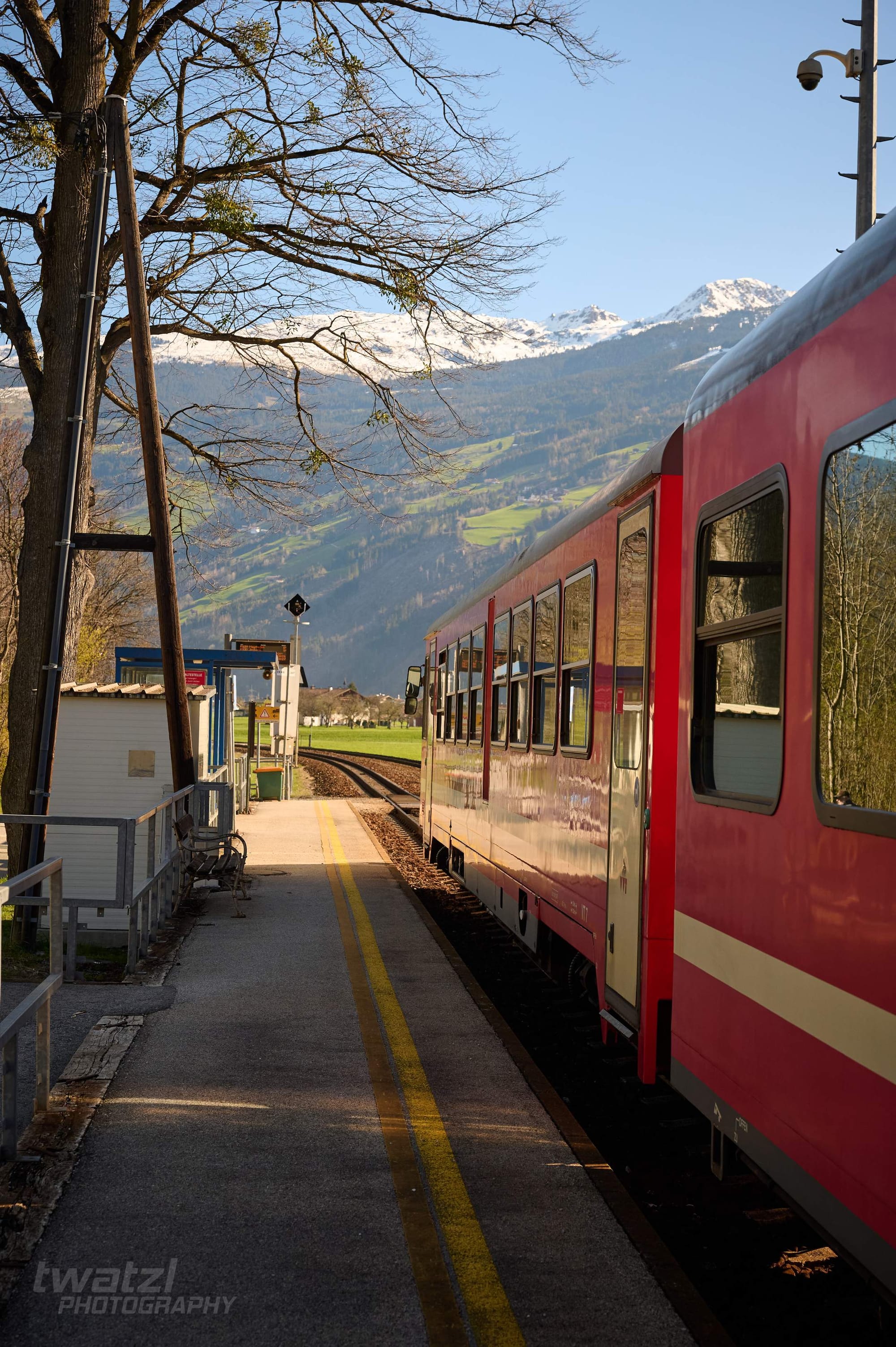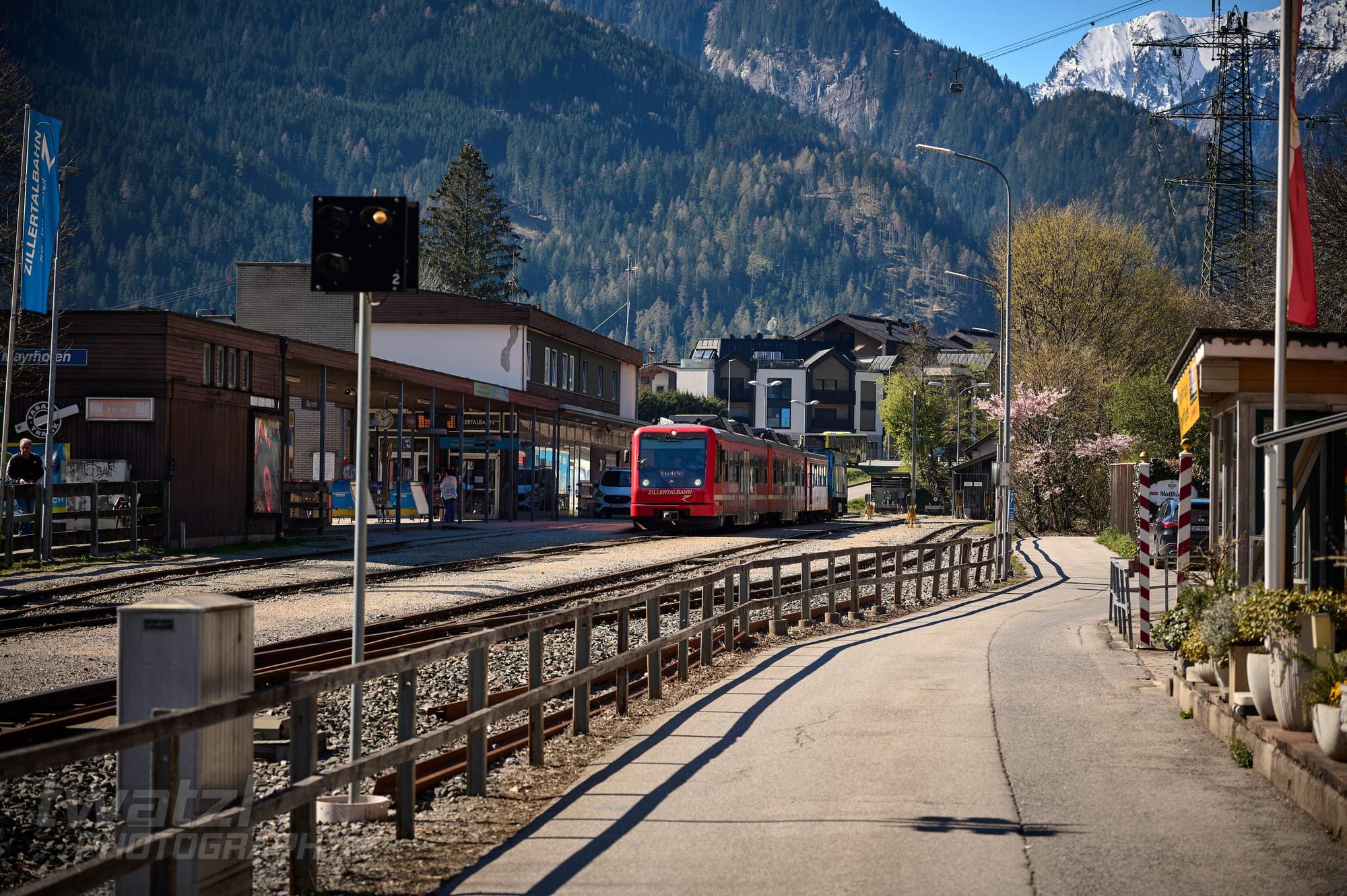 In Bichl hat man eine schöne Bergkulisse. Die Geografie der Zillertalbahn sorgt aber dafür, dass man oft ins Gegenlicht fotografieren muss. Wobei dieses Problem teilen sich viele Bahnen nördlich des Alpenhauptkammes.