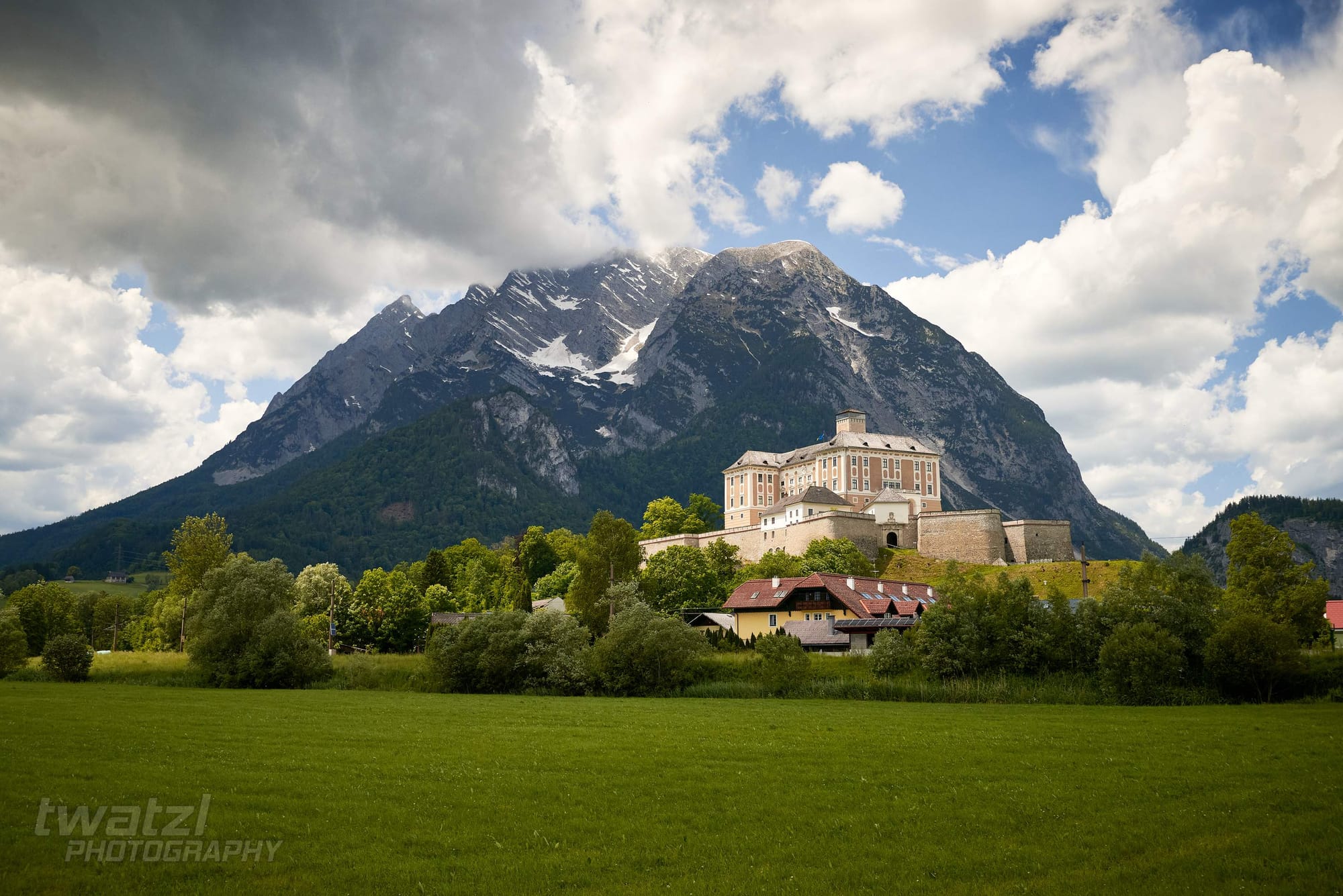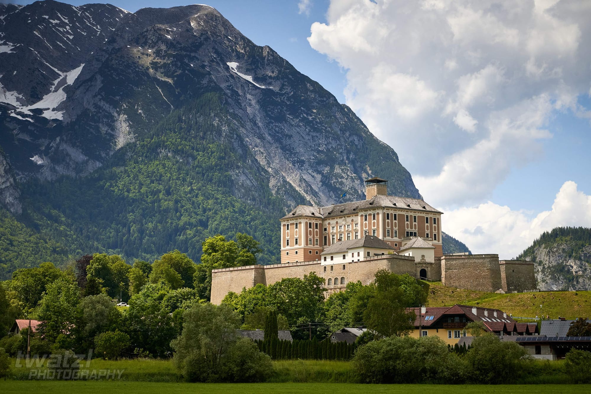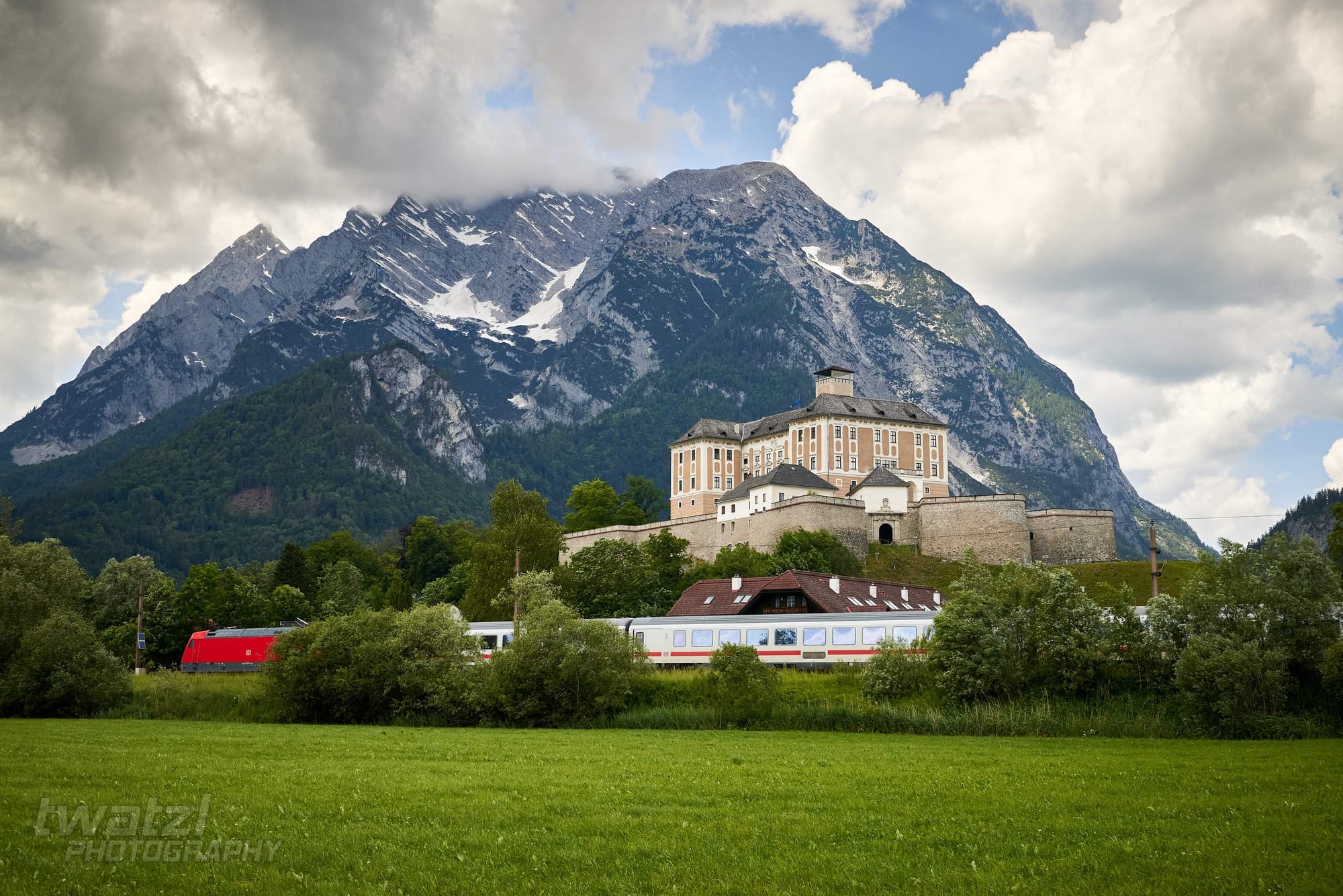 Als ersten Fotostandort habe ich das Schloss Trautenfels mit Grimming gewählt. Falls hier jemand von der ÖBB Infra mitliest: Es wär extremst leiwand, wenn man die Büsche da vielleicht wieder mal ein bisschen stutzen könnt. 😇