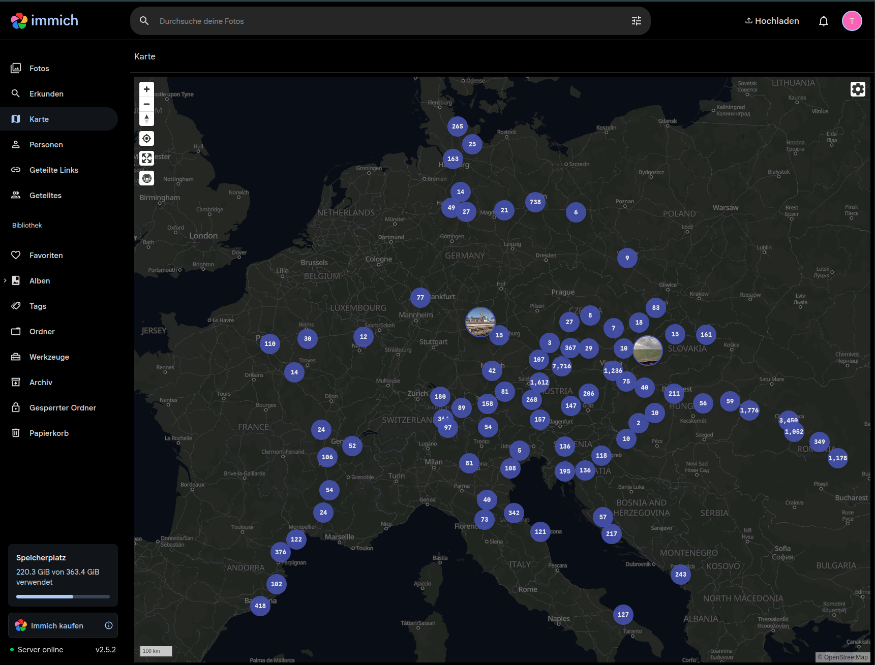 Da ich persönlich schon einen vorsortierte Ordnerstruktur in Nextcloud habe ist Nextcloud für mich die Single Source of Truth. Immich erlaubt hier Nextcloud als "Externe Bibliothek" einzubinden und somit einfach den Nextcloud Ordner weiterhin zu nutzen. Bei rund 300 000 Fotos hat der Import zwar einige Tage gedauert. Die Nutzung von Immich für Recherchen in der Fotosammlung ist aber extrem Komfortabel. So kann nicht nur nach Datum oder Aufnahmeort (sofern vorhanden) gesucht werden, sondern auch nach "ähnlichen Bildern", Personen und mittels OCR findet Immich sogar alle Bilder mit "ÖBB" oder einem "Fahrschein" im Bild.