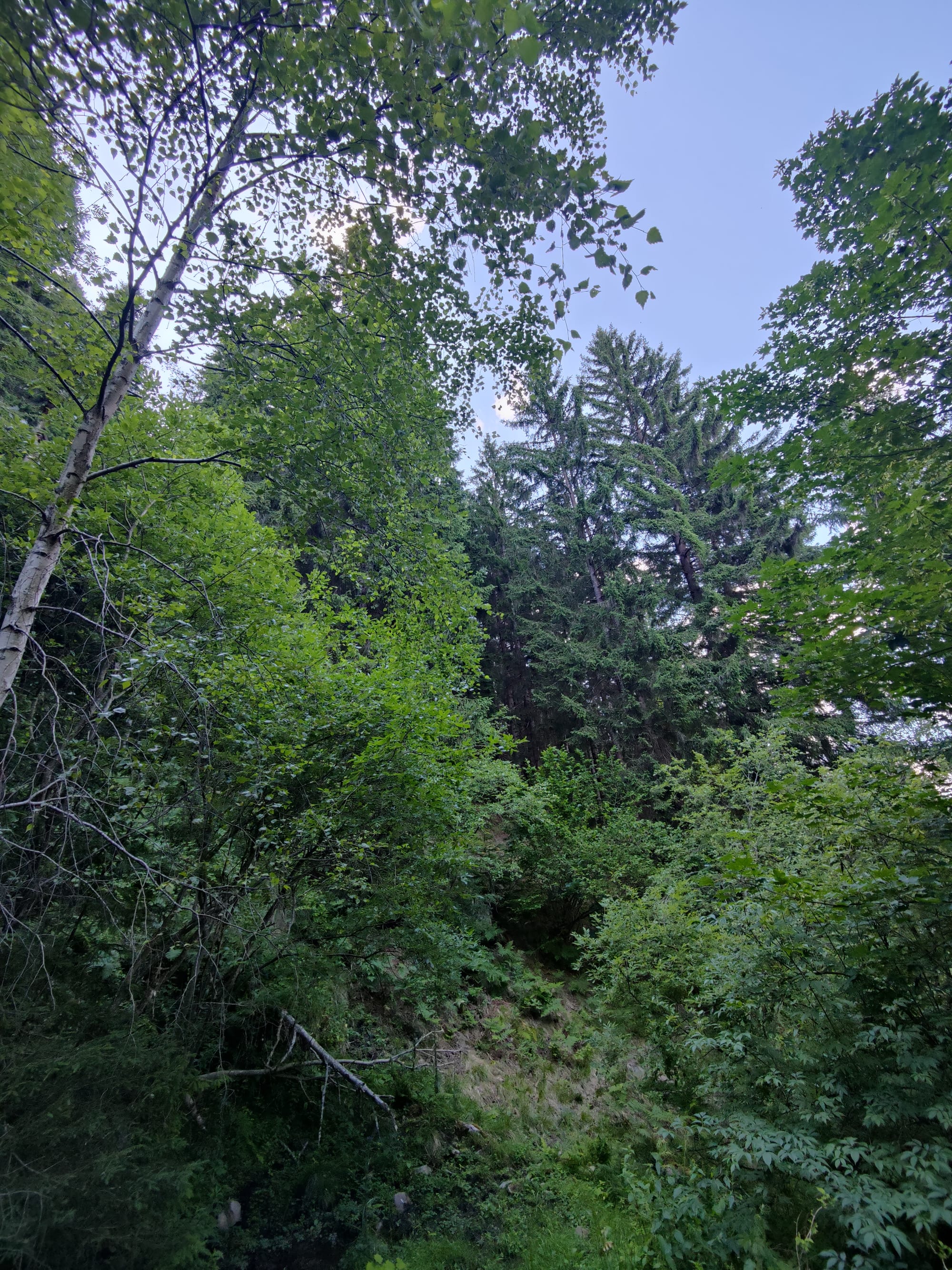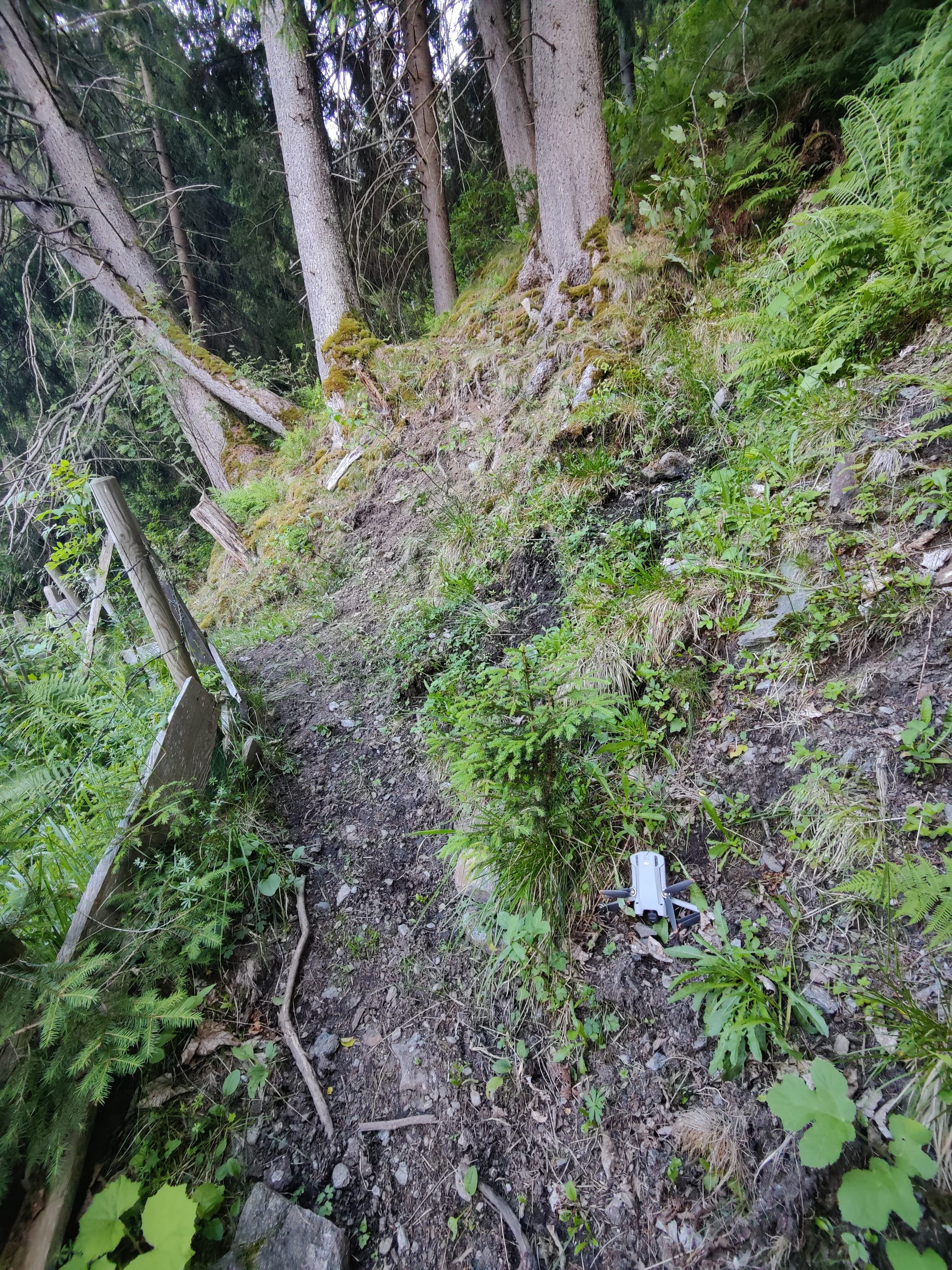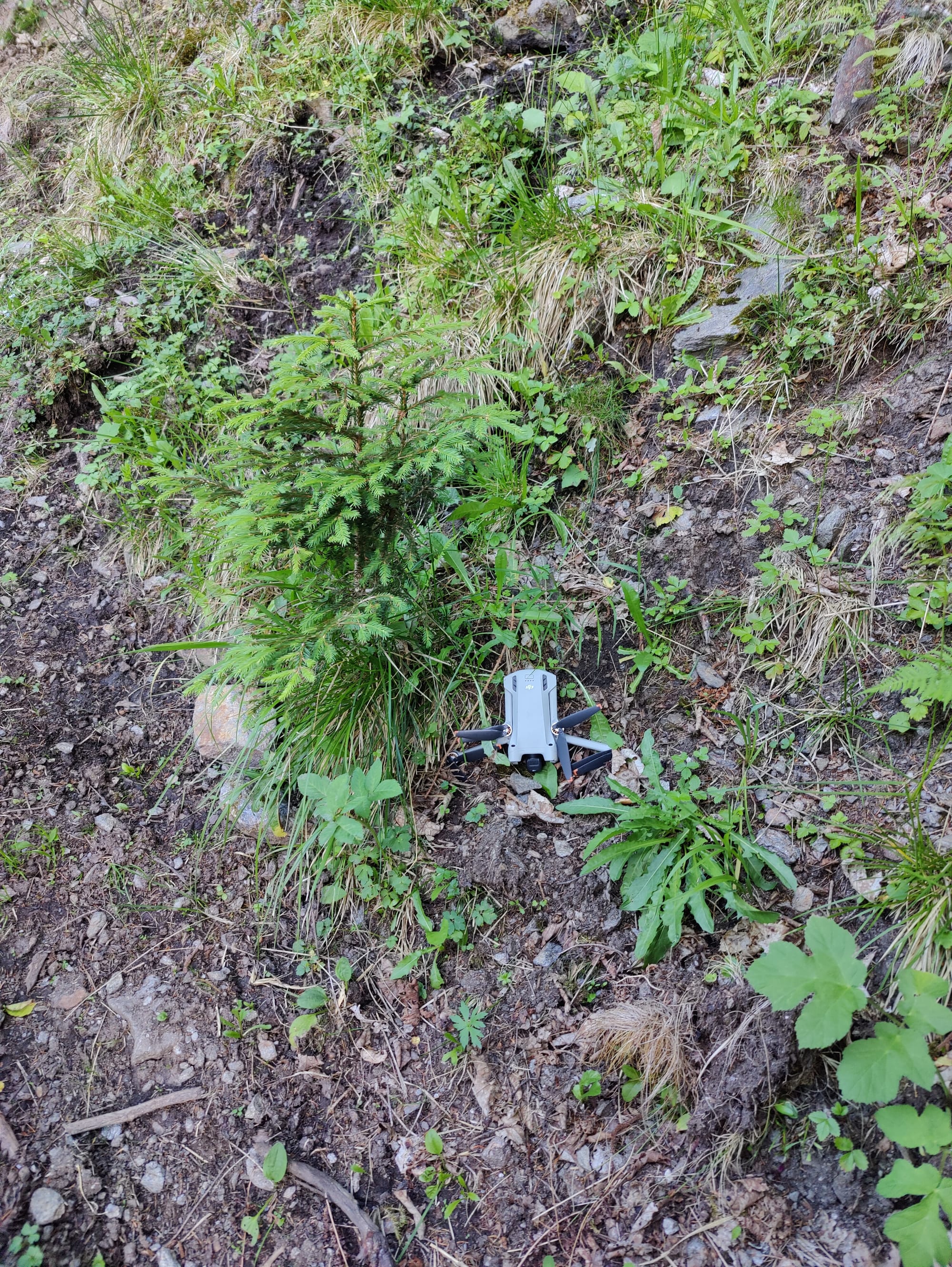 Leider ist mir im steilen Gelände beim Drohnenflug ein kleines Missgeschick passiert. Ich wollte rückwärts fliegen und die Landschaft einfangen, die Hänge in diesem Bereich sind aber so steil, dass ich hinten einen Baum erwischt habe, obwohl es nach vorne aussah als wäre ich 30m über dem Grund.